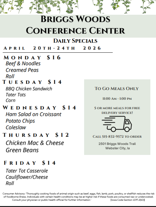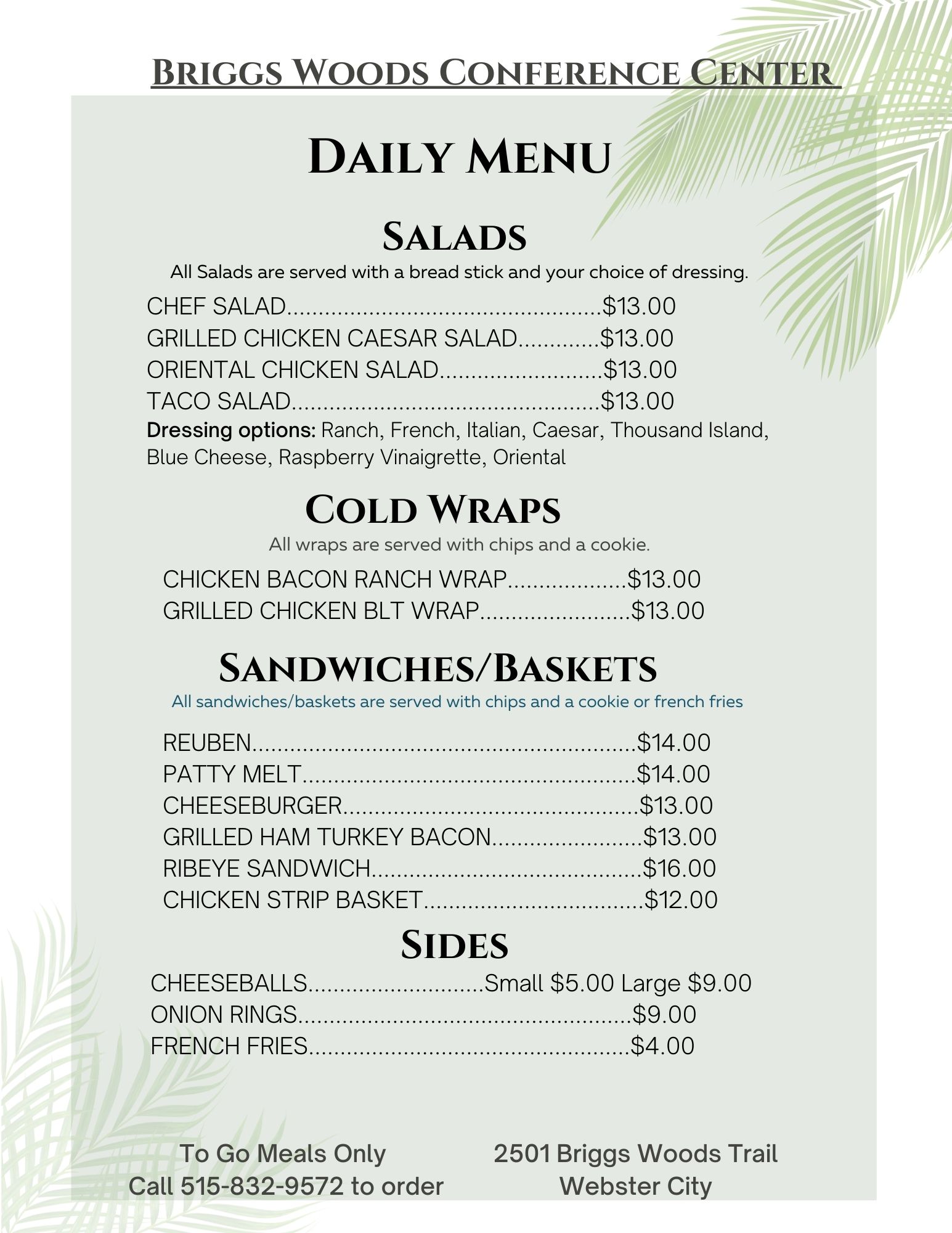 Pick up between 11:00 am and 2:00 pm Monday through Friday! For the week of April 20th-24th, 2026 Let’s talk about your event needs. Contact us today! BOOK NOW Daily Menu